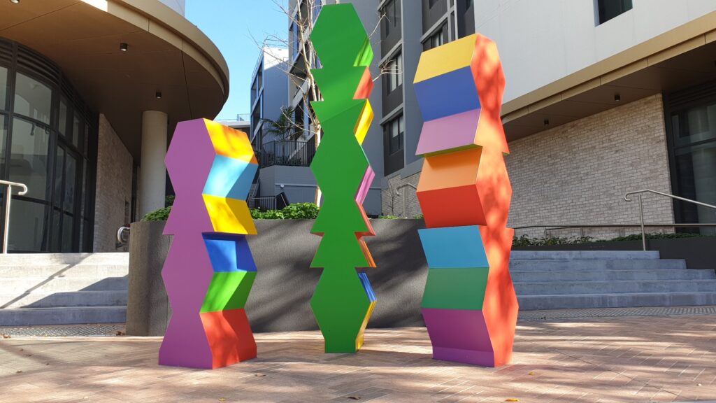 The centrepiece of Saad’s project, Embrace Monuments, features thirteen turned wooden posts, each painted in a vibrant palette of high-gloss colours. The installation is spread across two clusters along the street, with the larger cluster – comprising nine posts – positioned near Auburn North Public School. The sculpture’s design aims to infuse the streetscape with colour, form, and a sense of playfulness, providing both the school children and the wider community a space to connect with and enjoy.