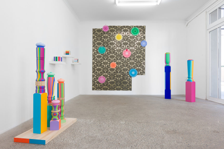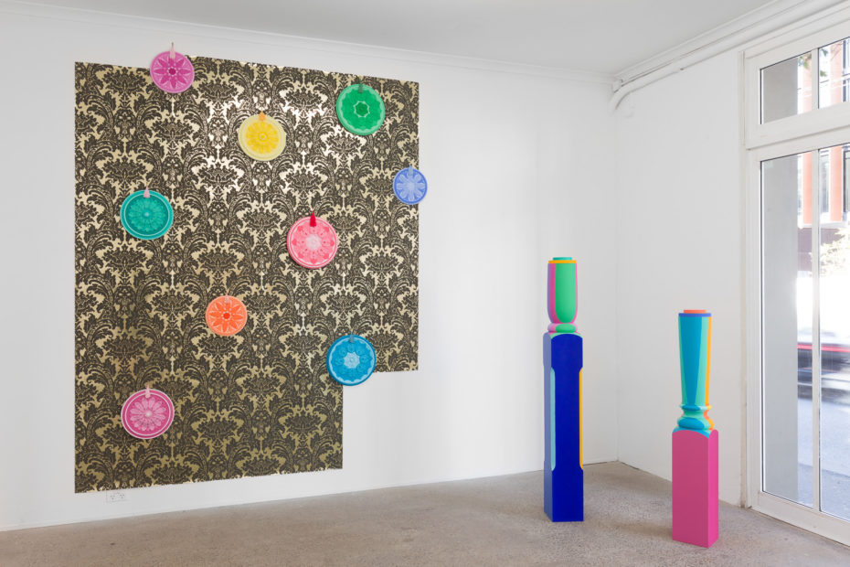 In this exhibition, the artists play with syntax and colour relationships that have evolved through considered juxtaposition, serendipity and play. While most works are authored individually, the installation is the result of many sessions of prior collaborative investigation. The architectural embellishments of the gallery’s four exhibition spaces have also played into this collaboration, and reveal surprising relationships between colour and form, as they also consider the material /immaterial porous boundaries within this exhibition.